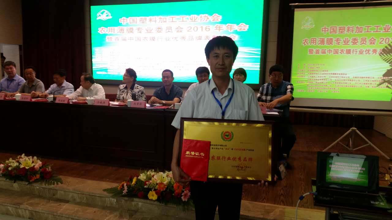 2016年6月17日,塑膜公司王同國(guó)總經(jīng)理和宋修華總工程師共同參加中國(guó)塑料加工工業(yè)協(xié)會(huì)舉辦的2016年年會(huì),龍興農(nóng)膜或得農(nóng)膜行業(yè)優(yōu)秀品牌稱號(hào)。